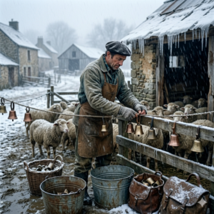 As the village was engulfed in snow and sleet, the cowboy hung small bells around the sheep pens and strung branches on the…