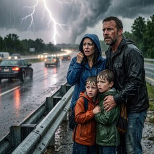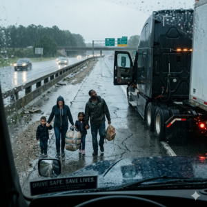 A truck driver slowed down on a stormy road when he spotted a small family walking through the pouring rain, soaked and carrying…
