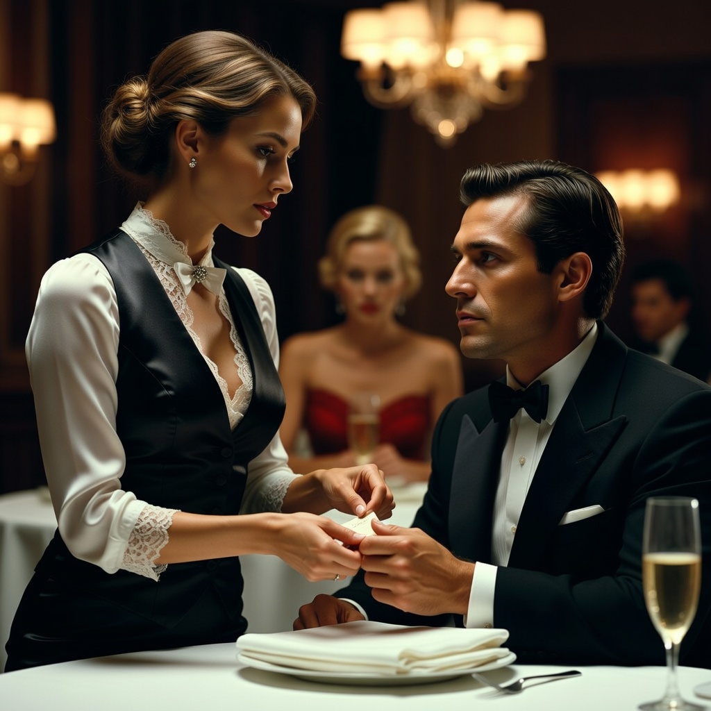 With trembling hands, she scribbled a message. She tore the small piece of paper off, folded it into a tiny square, and placed it discreetly beneath the fresh linen napkin she was carrying.