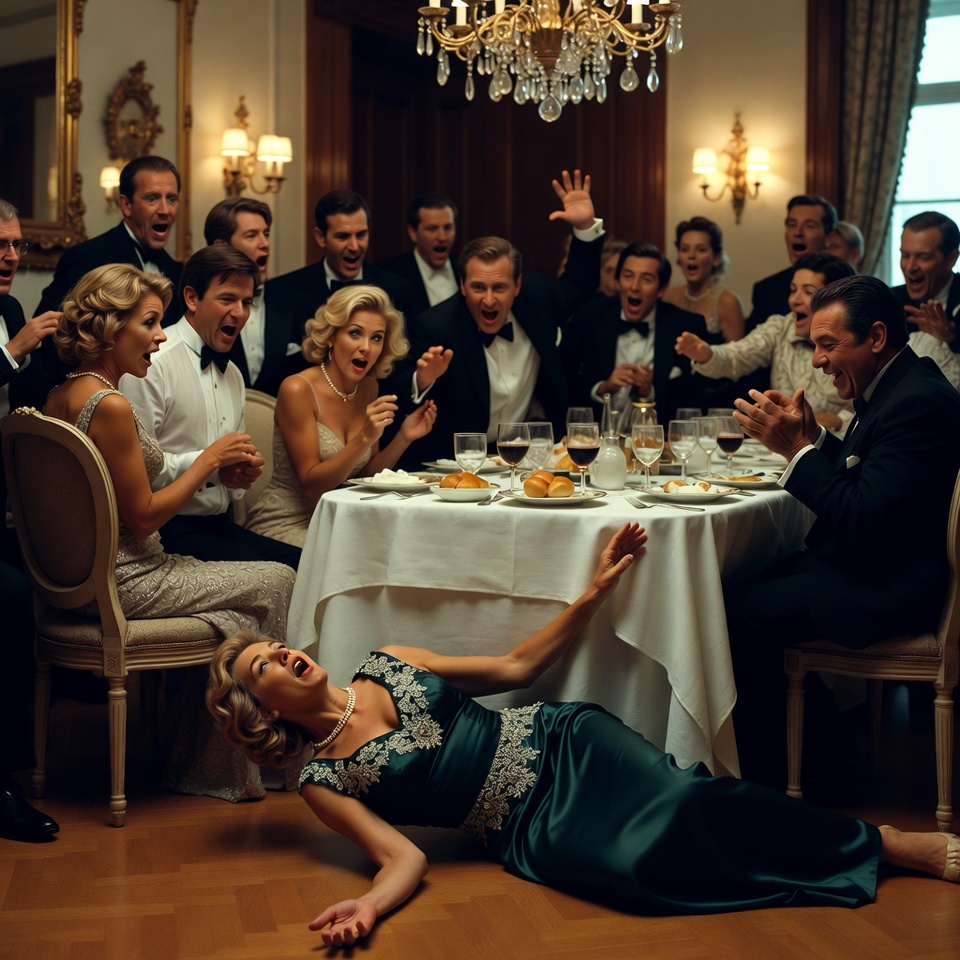 The tower fell. Hundreds of crystal glasses shattered, raining down on the unconscious matriarch, drenching her in expensive vintage champagne and broken glass.