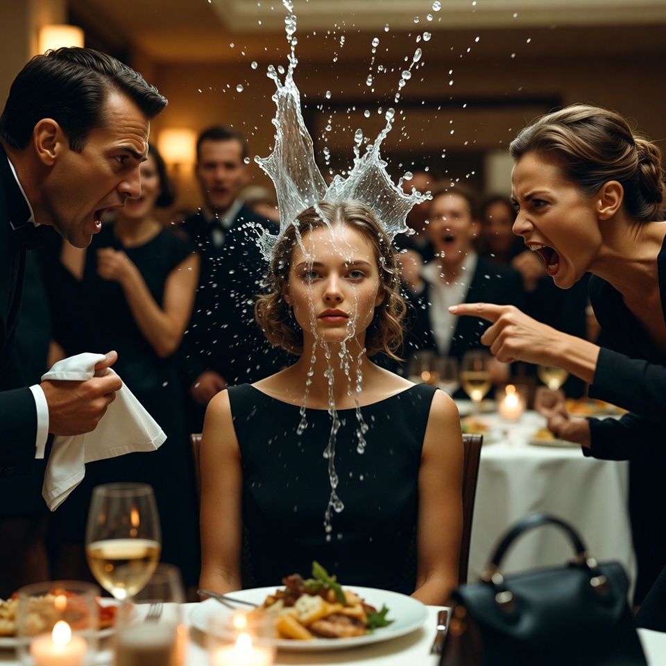 The ice water hit me full in the face. It soaked my silk blouse. It dripped down my hair, ruining my blowout. Ice cubes slid down my dress.