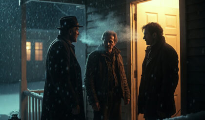 The porch light revealed a man standing just beyond the threshold, shoulders hunched, breath visible in harsh bursts. Behind him, two more figures shifted in the shadows.
