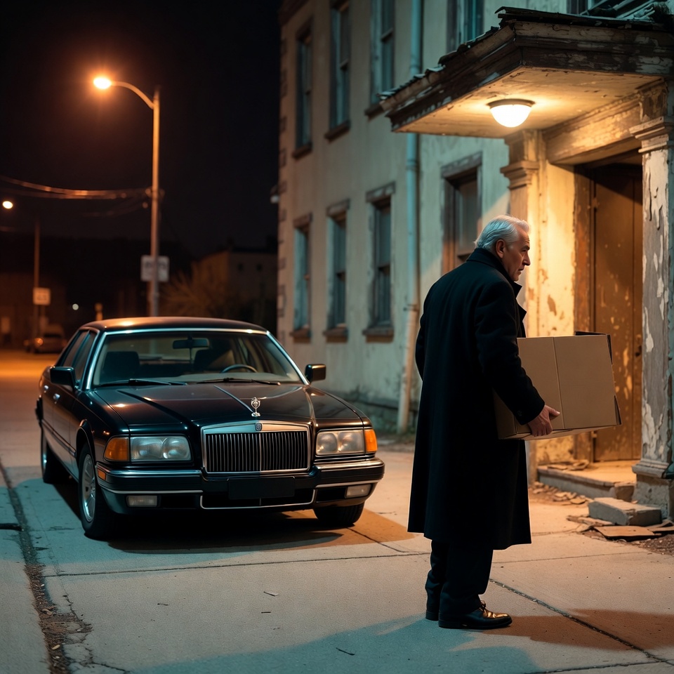 Standing outside the heavy iron doors wasn’t a thug. It was a man in a long, black wool coat. He was tall, silver-haired, standing under the streetlamp with the posture of a king in exile. Behind him, idling at the curb, was a black sedan that looked like it cost more than my entire building.