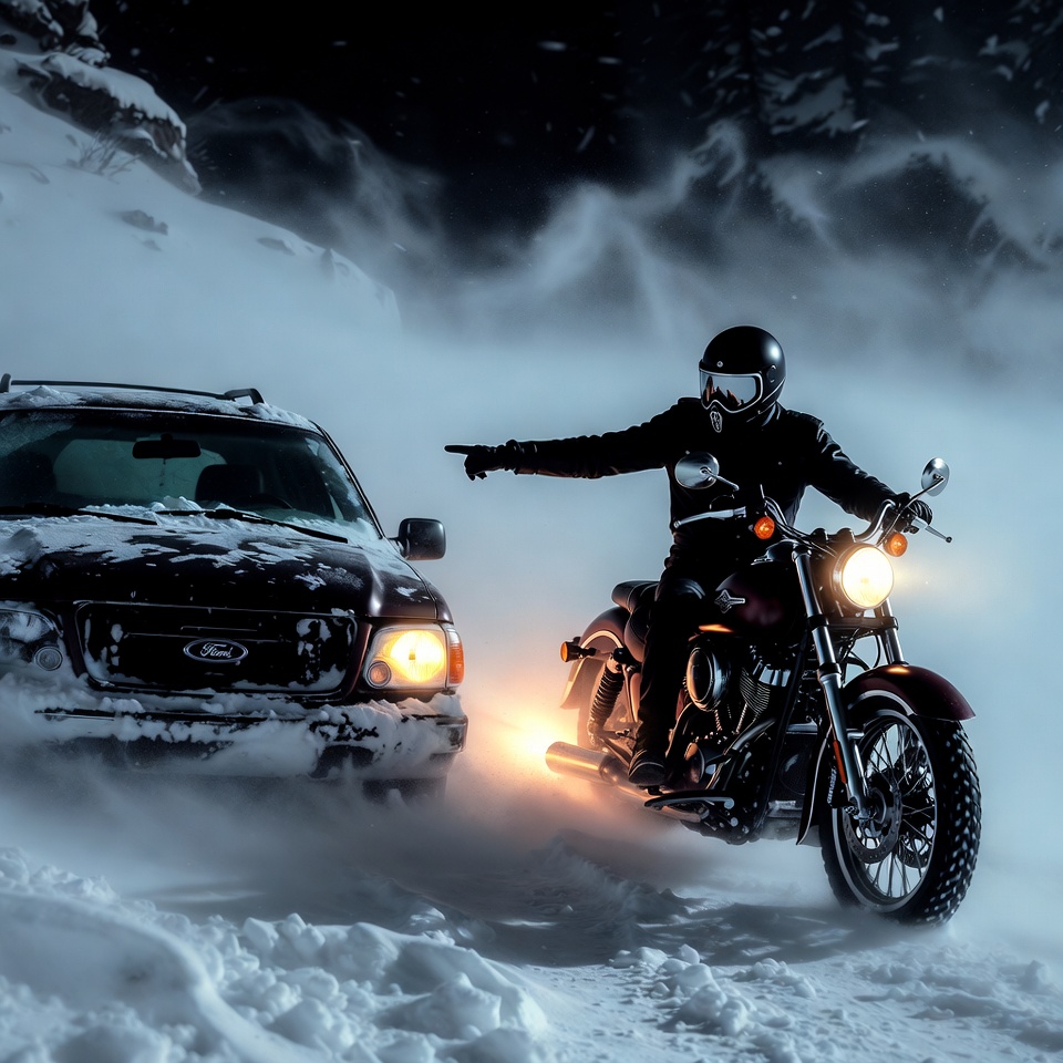 A black shape emerged from the whiteout. A rider, clad entirely in black leather, astride a massive, roaring machine that looked less like a modern vehicle and more like a beast of iron and chrome. The bike tore through the snowdrifts as if they were mist.