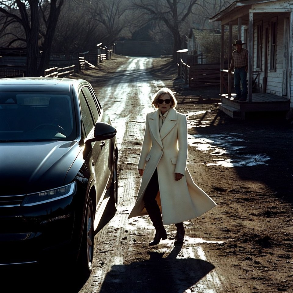 She stepped onto the dusty Wyoming earth wearing a flawless, tailored cream cashmere coat, dark sunglasses, and immaculate leather boots. She looked entirely, absurdly out of place.