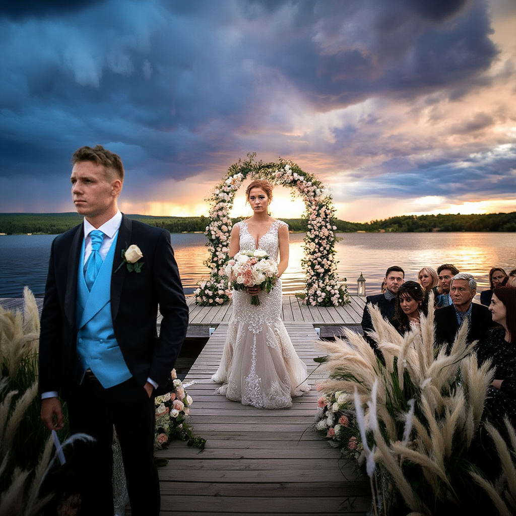 Emily Carter stood frozen at the altar, her hands trembling around a bouquet of wildflowers she had picked herself that morning. Her wedding dress was simple—ivory chiffon, borrowed from a friend, altered by hand late into the night. There were no diamonds, no designer heels, no glittering accessories. Just Emily, her nervous smile, and a love she believed was enough.