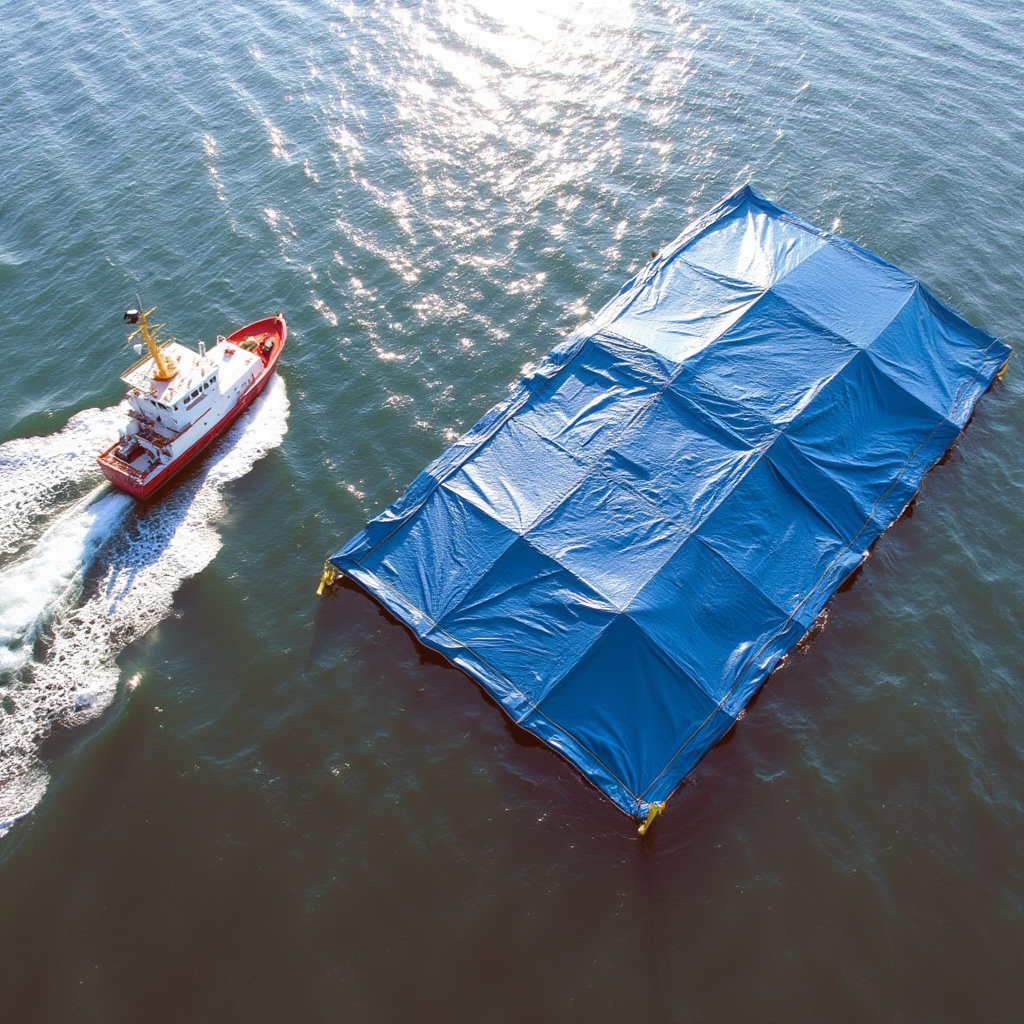 As they approached, the object came into view: a massive blue tarp floating low in the water, stretched tight over something large. It was tied down with thick marine rope, the knots precise and deliberate.