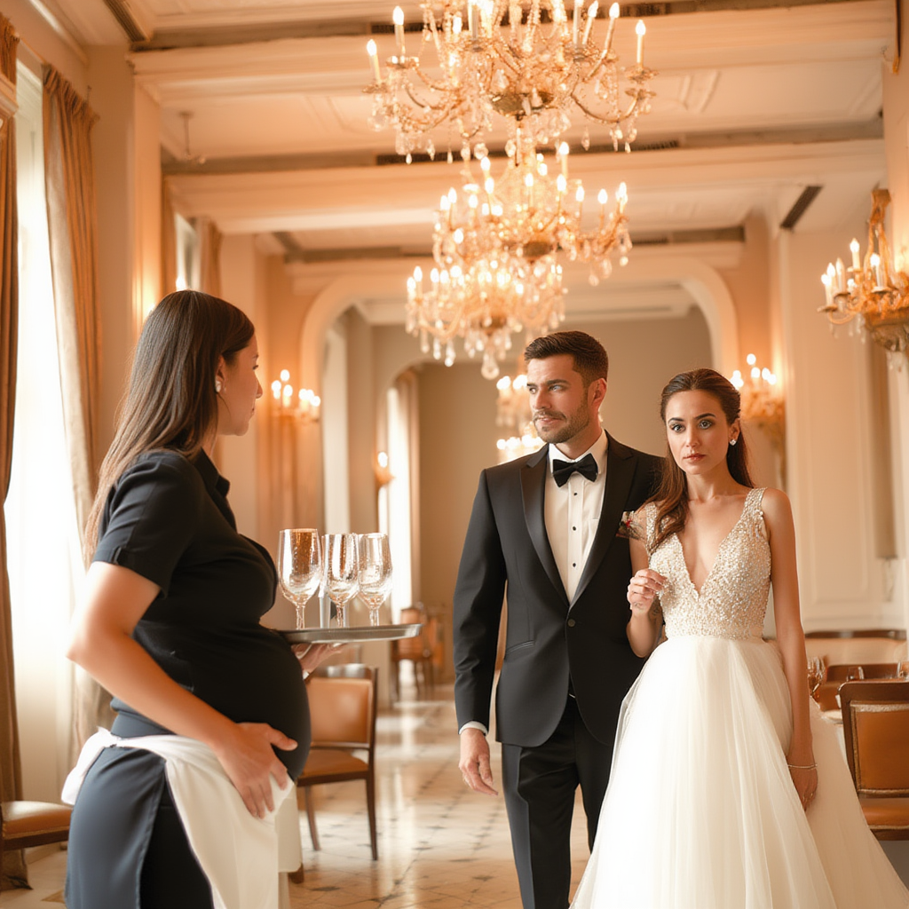 She stood near the far end of the ballroom, half-hidden behind a pillar, wiping down a table with slow, careful movements. Her uniform was plain black, her hair pulled back tightly, her face thinner than he remembered. And beneath the fabric of her apron, her belly was unmistakably round.