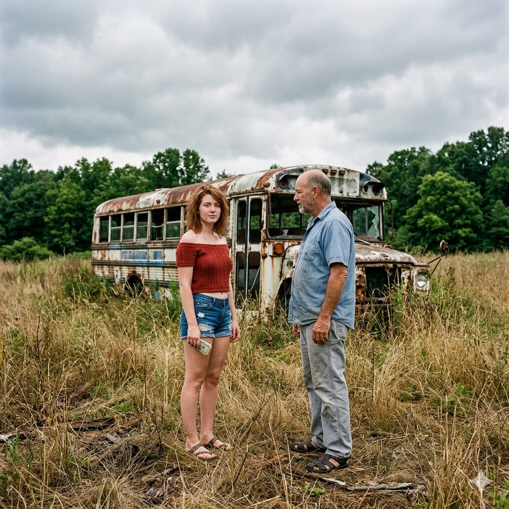 The rusted bus sat at the edge of a forgotten lot, its once-bright paint bleached into a tired shade of pale blue. Wild grass curled around its tires like nature was slowly reclaiming it, and a crooked “FOR SALE” sign dangled from the cracked windshield, its numbers long faded by sun and rain.