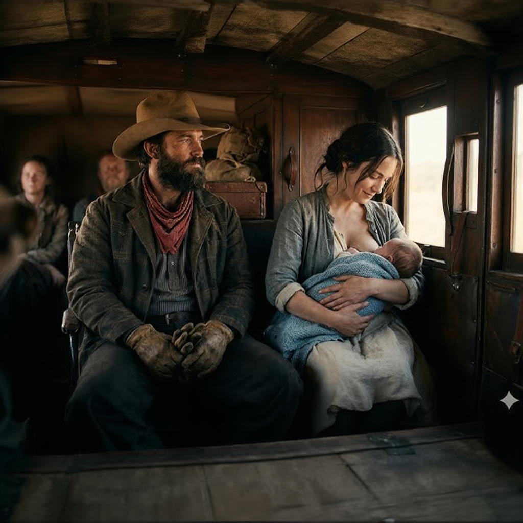 The stagecoach rattled like it might come apart at any moment, its wooden frame groaning against the endless stretch of prairie. Dust swirled in through the cracked window, settling over everything—boots, hats, and the tiny bundle in Caleb Turner’s arms.