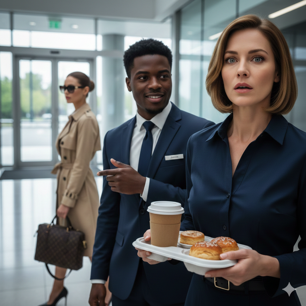 The building was sleek, glass and steel, the kind of modern tower that screamed success and intimidation. I approached the front desk, feeling giddy, carrying my tray of pastries and two coffees.