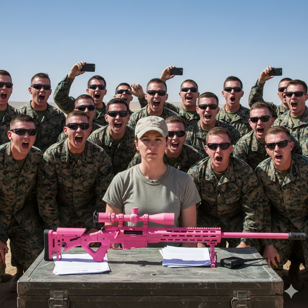 It wasn’t cruel at first—more the casual, automatic kind that came from habit. Marines at Camp Redstone had seen every gimmick imaginable: chrome barrels, skull grips, laser etchings that screamed ego. But no one had ever walked onto Range Echo with a rifle like hers.