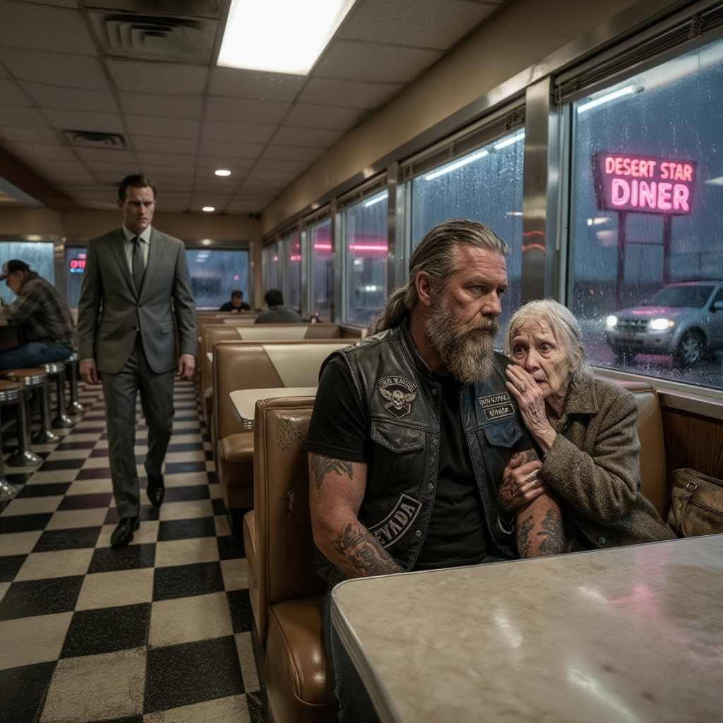 “Please Pretend You’re My Grandson,” Said the Old Lady — What the Hells Angel Did Next Shocked Everyone The rain came down in sheets, blurring the neon glow of the Desert Star Diner into streaks of red and pink against…