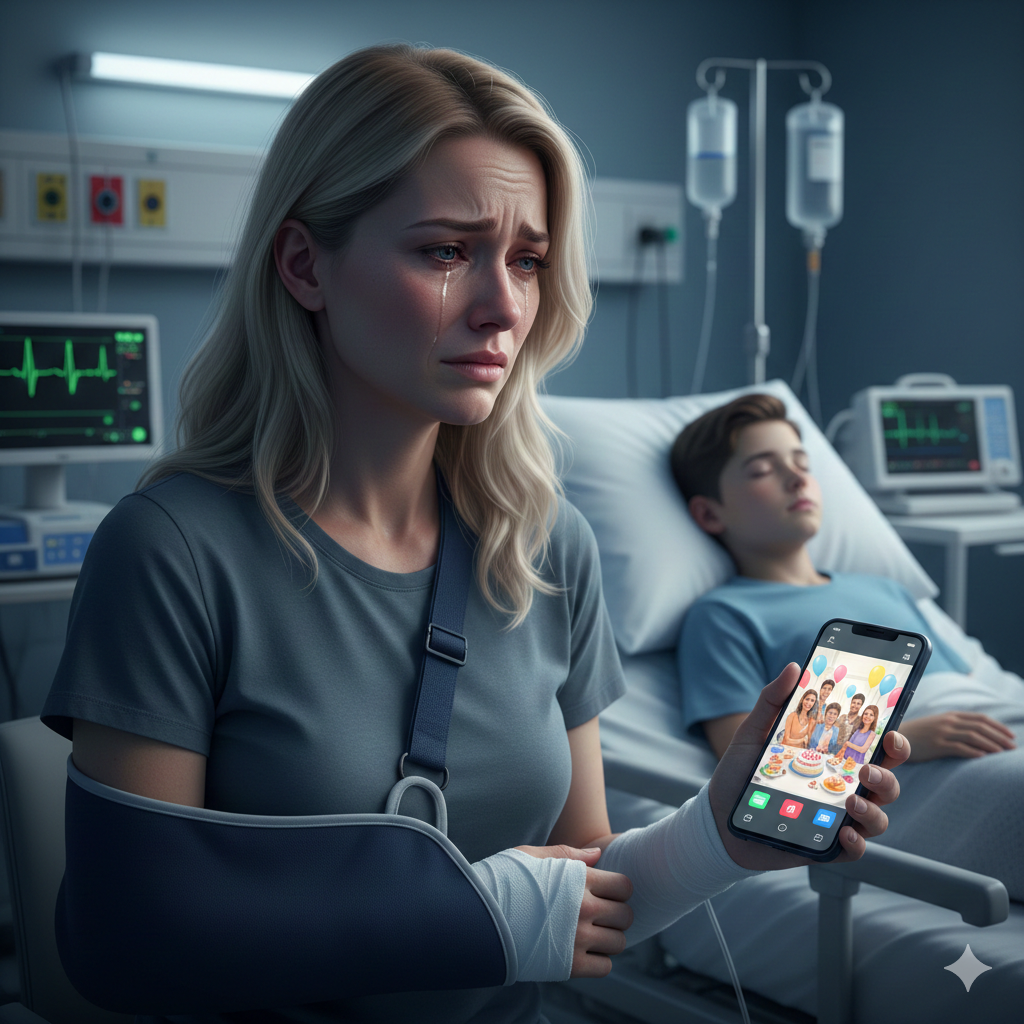 Evan was asleep, his arm wrapped in a bright blue cast that looked too cheerful for how fragile he felt to me. I sat beside his bed, listening to the beep of the monitor, refreshing the chat again and again.