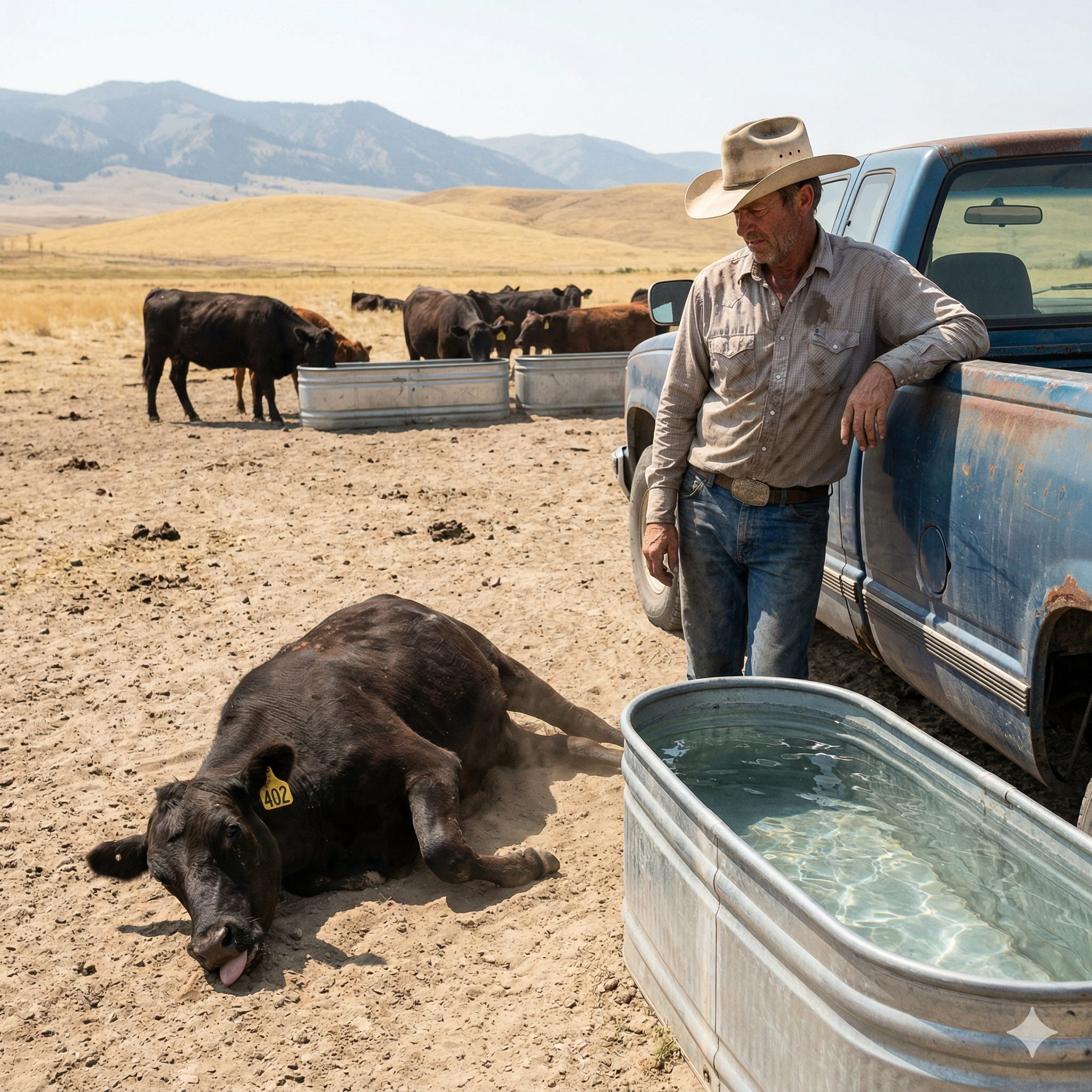 Ten feet away from Silas, a prime heifer—number 402—was trembling. Her ribs poked through her hide like the rafters of a ruined house. Her tongue, swollen and blackening, lolled from her mouth. She was standing inches away from a galvanized steel trough. The trough was brimming with clear, cool water, piped directly from the deep mountain aquifer.