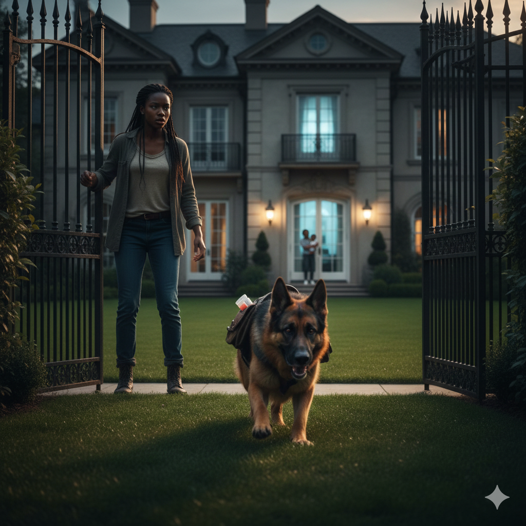 It tore across the cold morning like something dying—a raw, broken sound echoing off the walls of the gated community where she walked dogs for rich people who forgot they existed until they needed them groomed. One minute, Duke, her German Shepherd, was at her side, leash loose, ears perked. The next, he sprinted under the iron fence toward the manicured mansion across the street.
