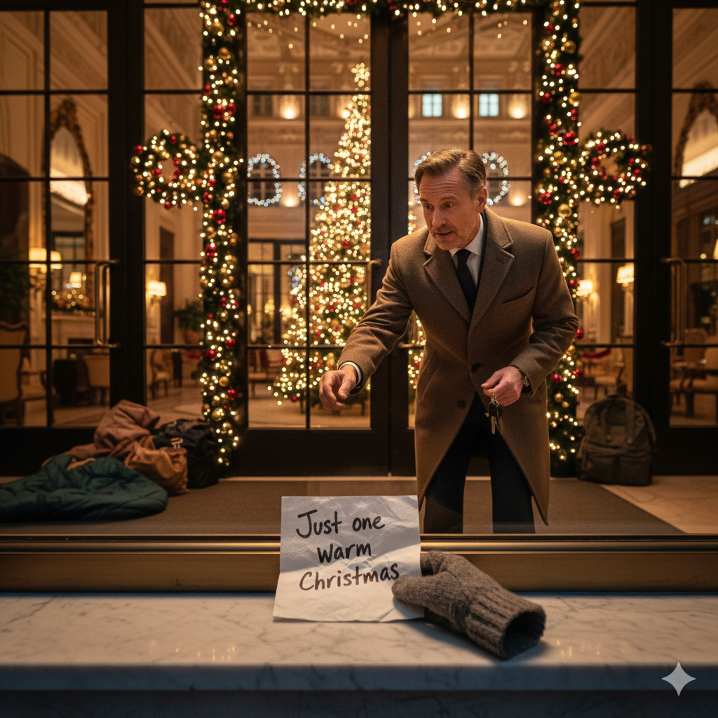 That night, Daniel stood by the penthouse window, looking down at the hotel entrance. Snow fell in soft sheets, coating the sidewalk.