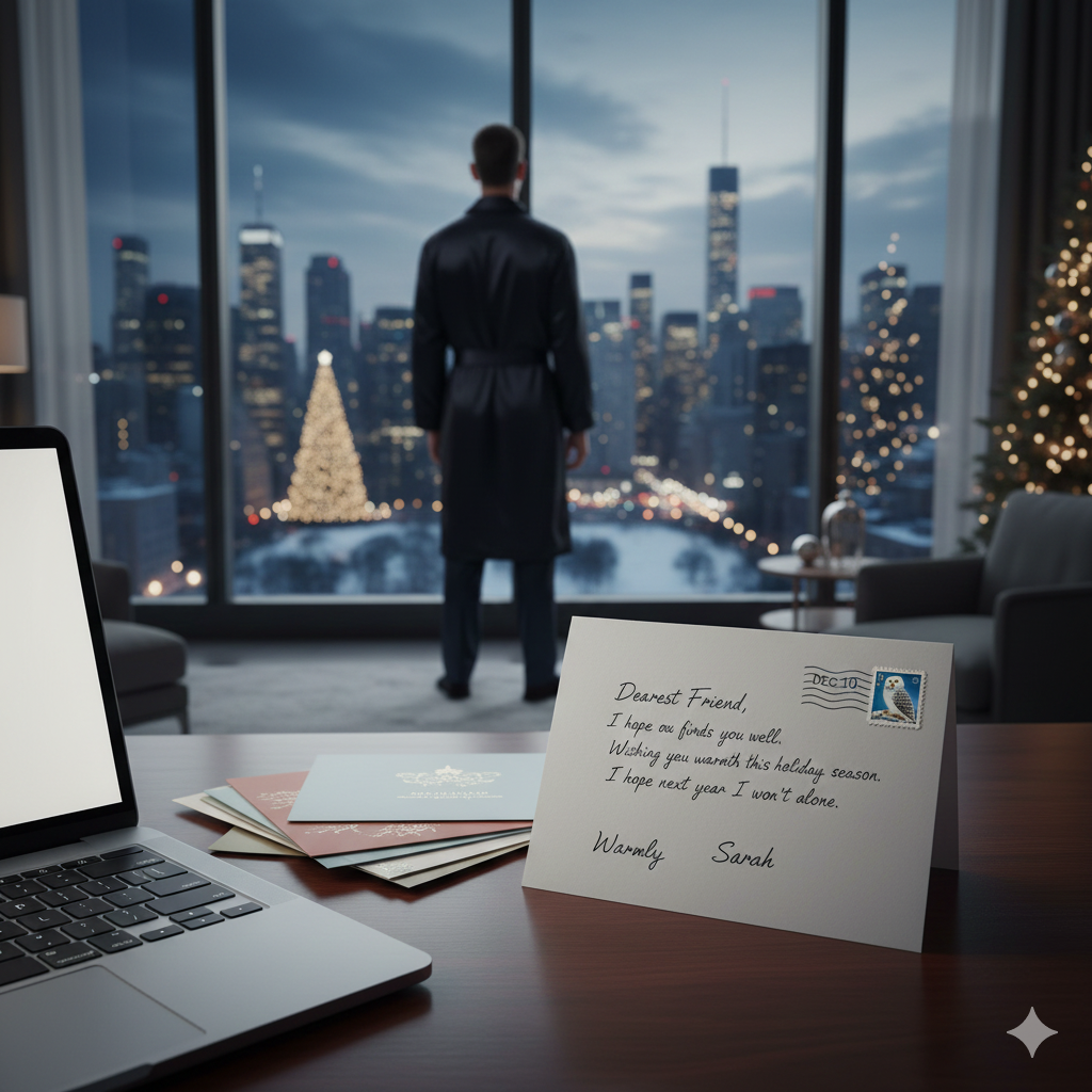He bought one at a corner pharmacy, feeling vaguely ridiculous as he stood in line with last-minute shoppers. The card was simple. Neutral. Snowflakes.