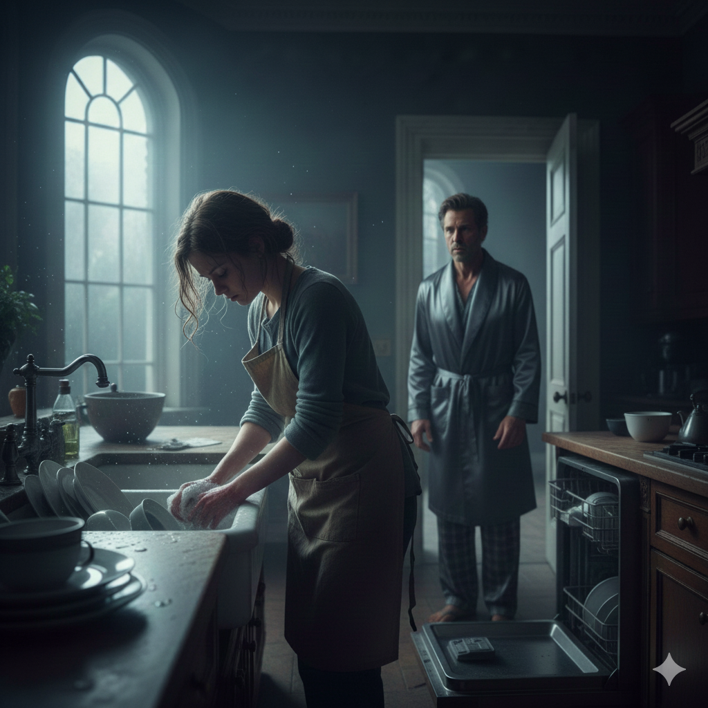 Her hands were submerged in gray, soapy water. Even from the doorway, Arthur could see they were red, raw, and trembling. Her breath was coming in short, jagged hitches, as if she were fighting back a sob.