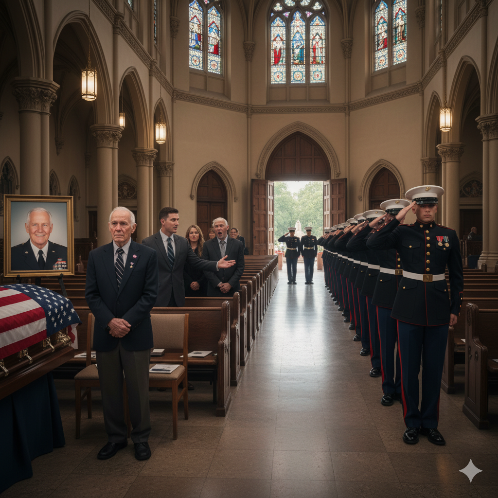 Inside, the chapel buzzed with soft conversations, the shuffle of dress shoes, the occasional stiff sob. Flower arrangements flanked the casket, a dark walnut box draped in the American flag. Marines in full dress blues stood rigid near the front.