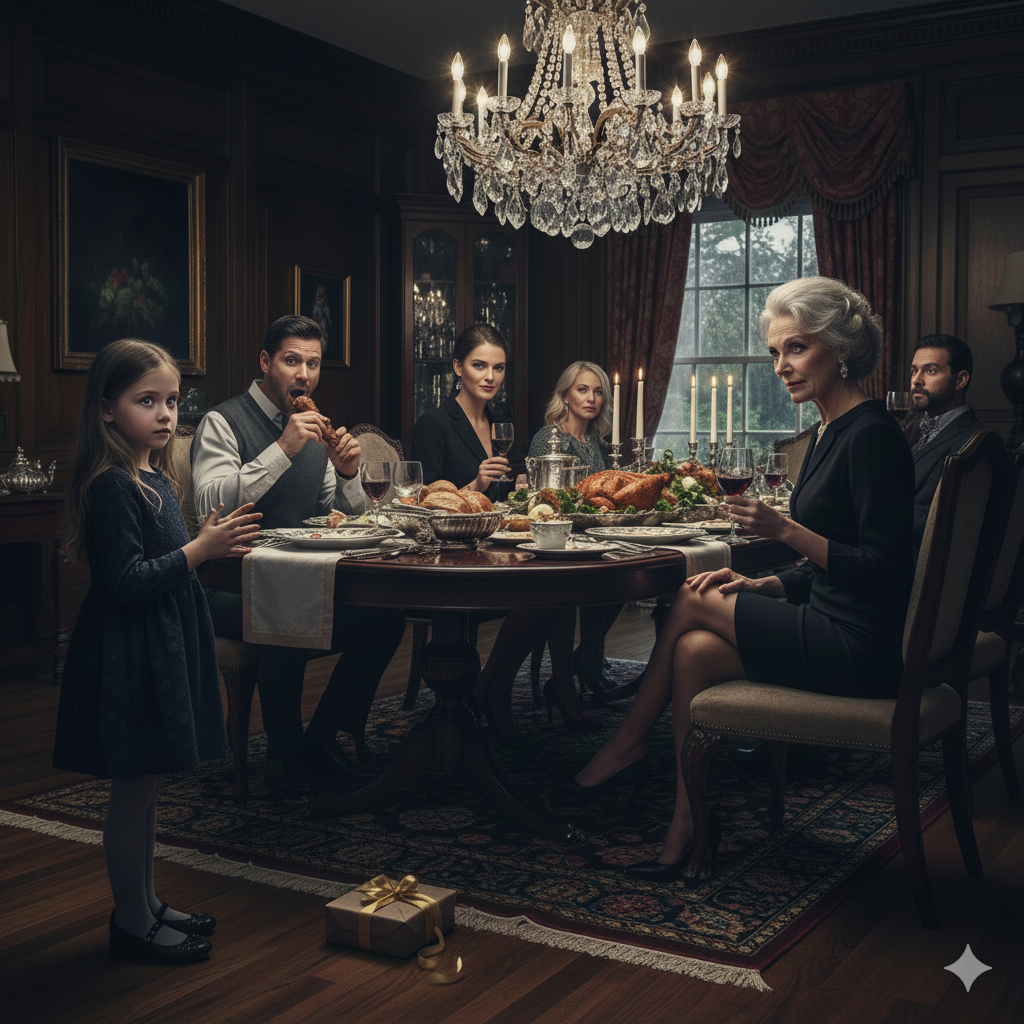 The air in the room was a suffocating cocktail of rosemary-rubbed turkey, expensive French butter, and the sharp, powdery scent of Martha’s Chanel No. 5. My seven-year-old, Lily, sat rigid in her velvet dress, the deep navy fabric making her skin look even paler under the harsh yellow lights. Her legs dangled just short of the floor, swinging in a tiny, rhythmic arc of anxiety. In her lap, she cradled a small, rectangular gift wrapped in gold foil—the only thing in this house that belonged to us.