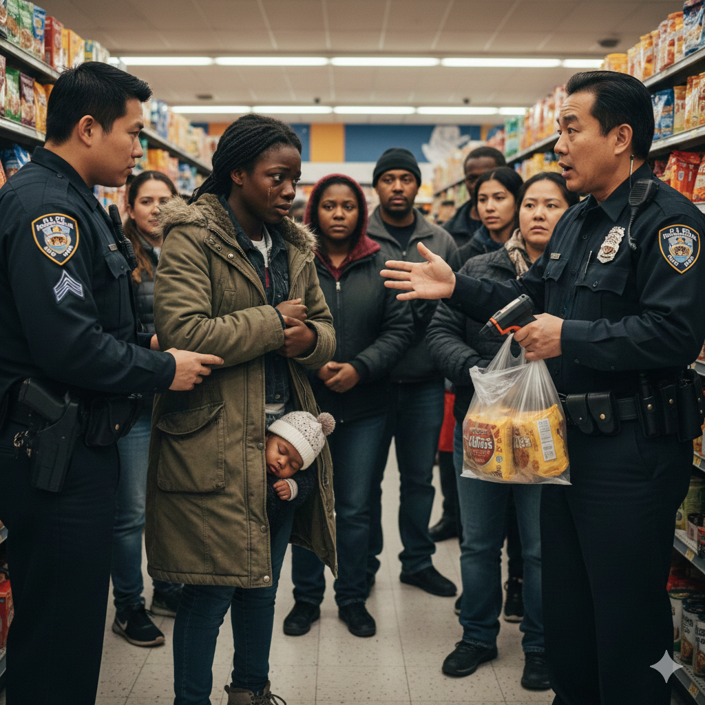 Everyone thought the poor Bl:ack mother would be dragged to jail for stealing noodles—until what slipped from her coat made the supermarket owner freeze in place.