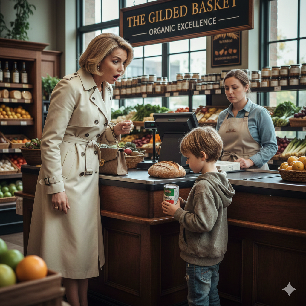 Standing near the artisanal bread display was a boy, no older than ten. His oversized hoodie was stained with dark streaks of grease and mud. His jeans were frayed at the knees, and his sneakers looked like they had survived a war. He was holding a single, dented tin of generic chicken soup and a small loaf of day-old bread.