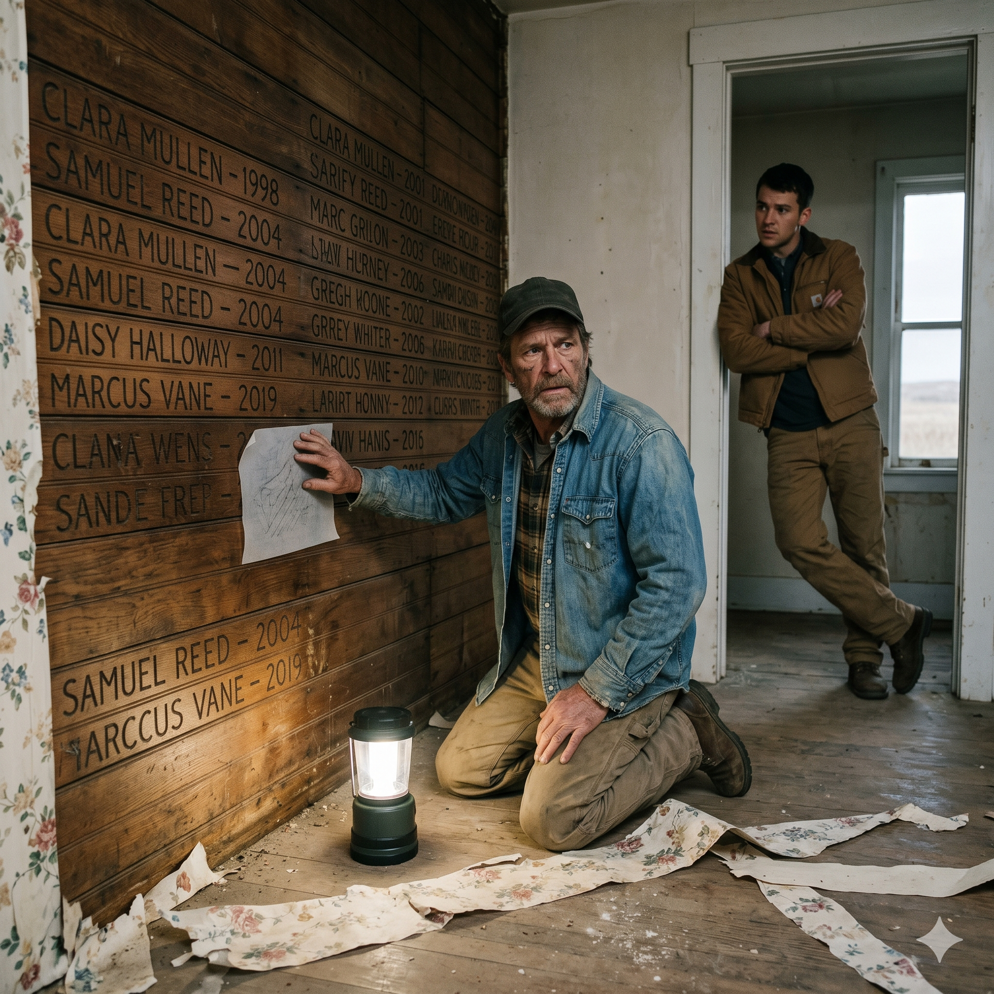 The carvings weren’t graffiti. They were precise, professional, almost liturgical. Boone spent the next four hours tearing down the wallpaper in every room. By dawn, the house was a skeleton of secrets. There were over sixty names etched into the walls, the doorframes, and even the underside of the floorboards.