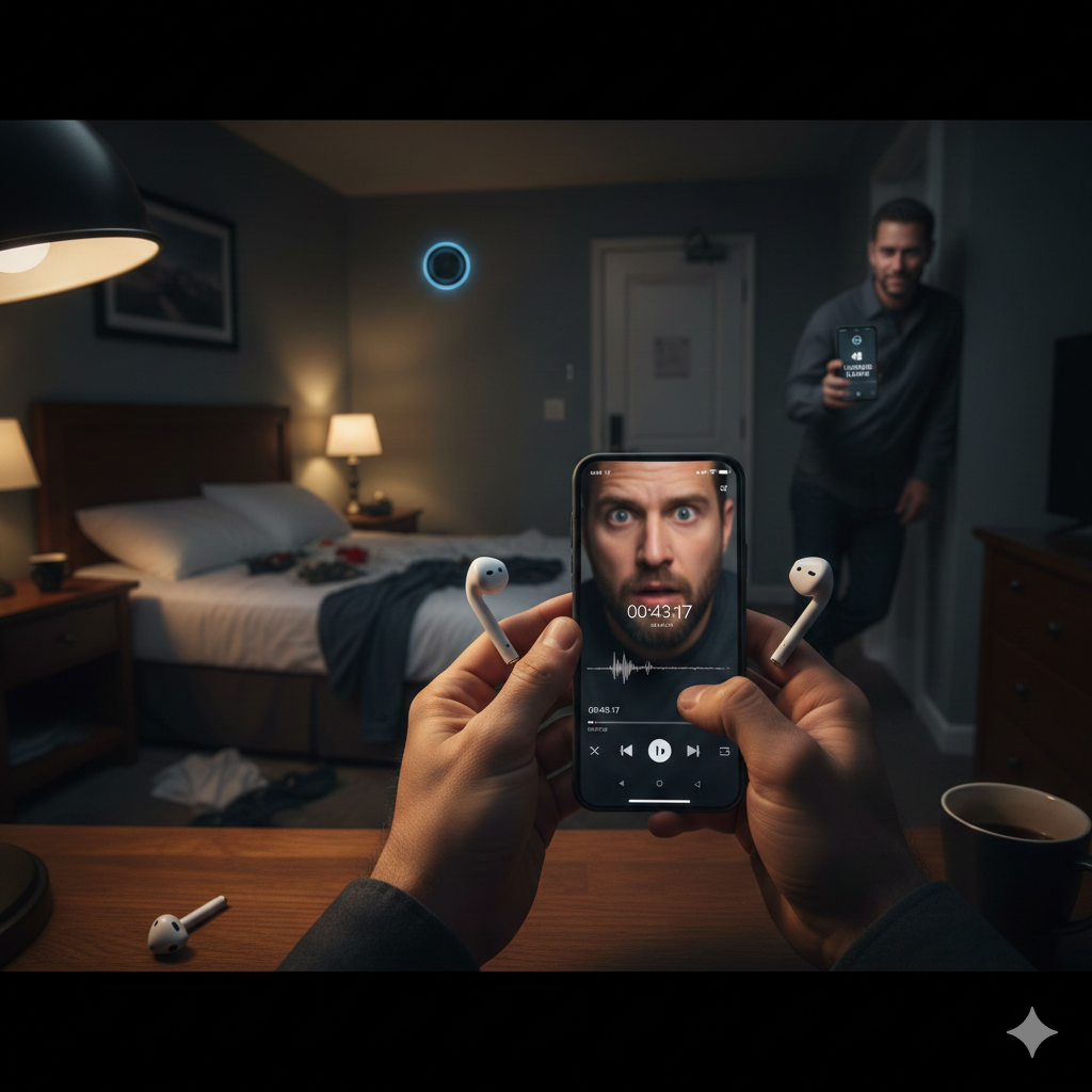 While sitting in the hotel lobby, I felt a strange prickle of anxiety. I opened my security app on my phone. Usually, I just check the front door. This time, I tapped the audio feed for the guest room.