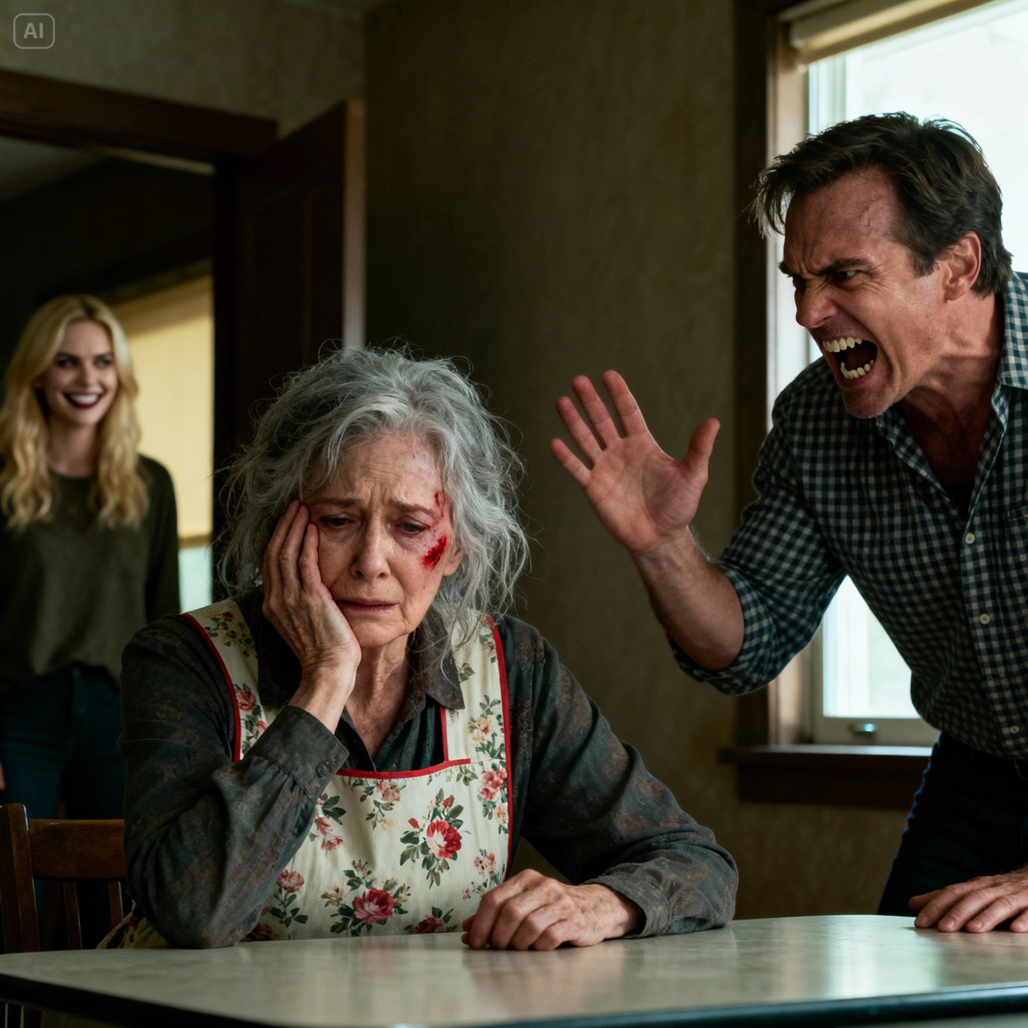 The copper tang of blood filled my mouth before I even felt the sting. The sound of the slap—sharp, wet, and final—echoed off the oak cabinets my husband, Henry, had built with his own hands forty years ago.