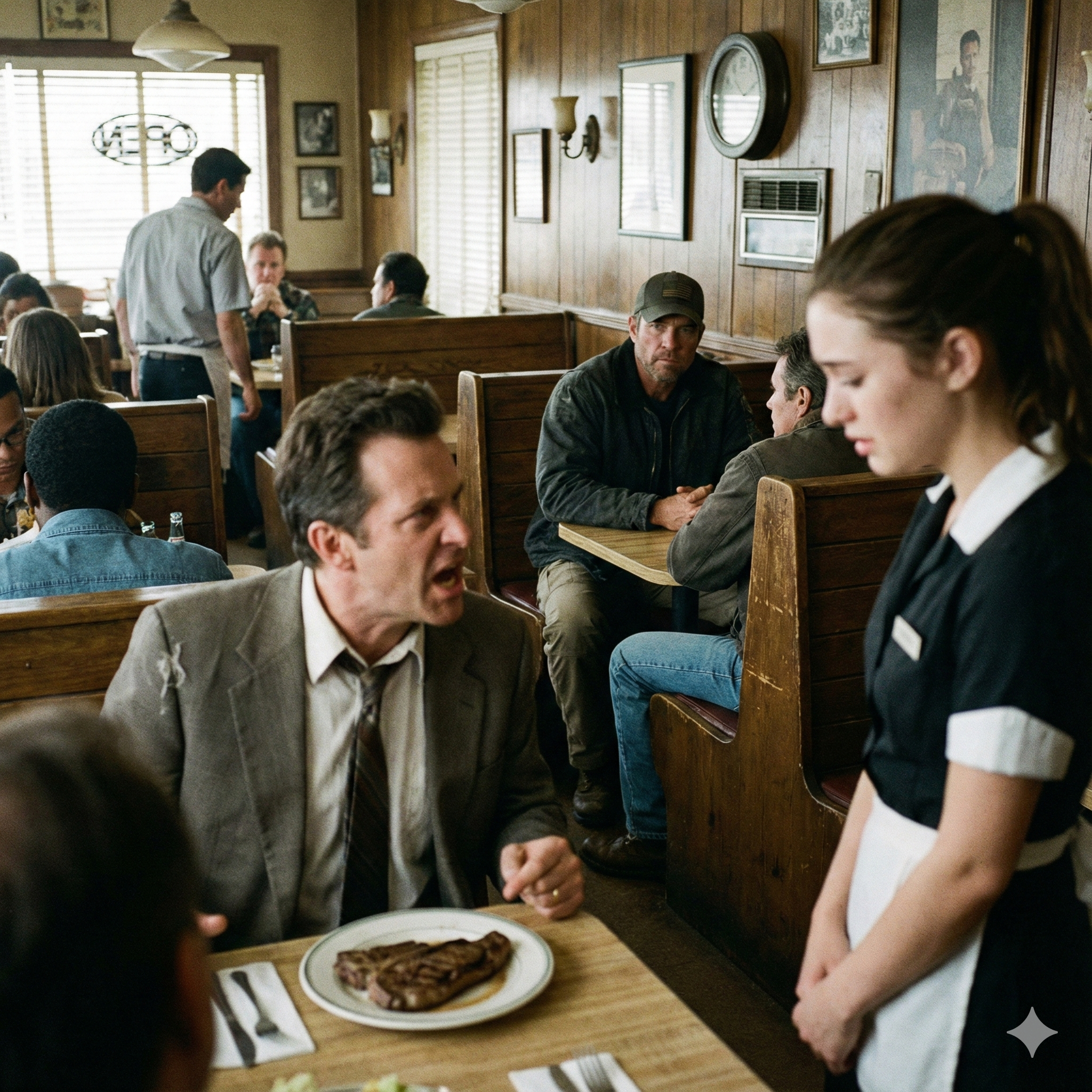 He stood up. He wasn’t as tall as Tyler, maybe six feet flat, but there was a density to him, a stillness that felt like the air before a tornado. He walked toward the center of the diner, his boots making no sound on the tile.