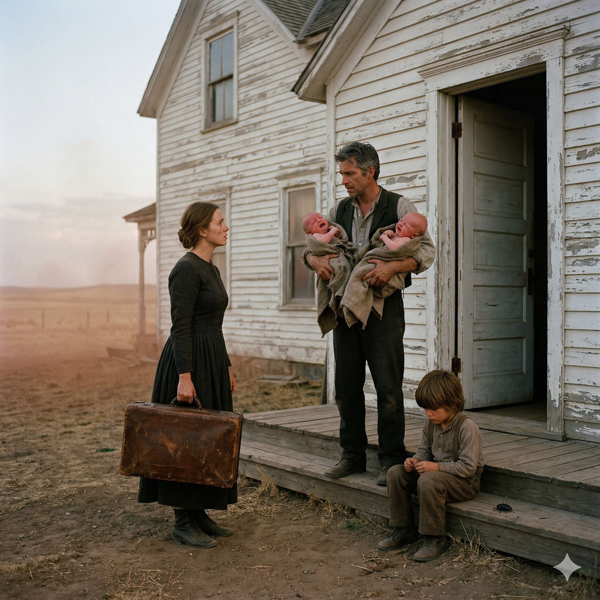 Silas Sterling stood there. He was a man carved from exhaustion and something harder beneath it. He held a screaming infant in each arm—tiny faces purple-red, voices raw from hours of crying. At his feet sat a boy.