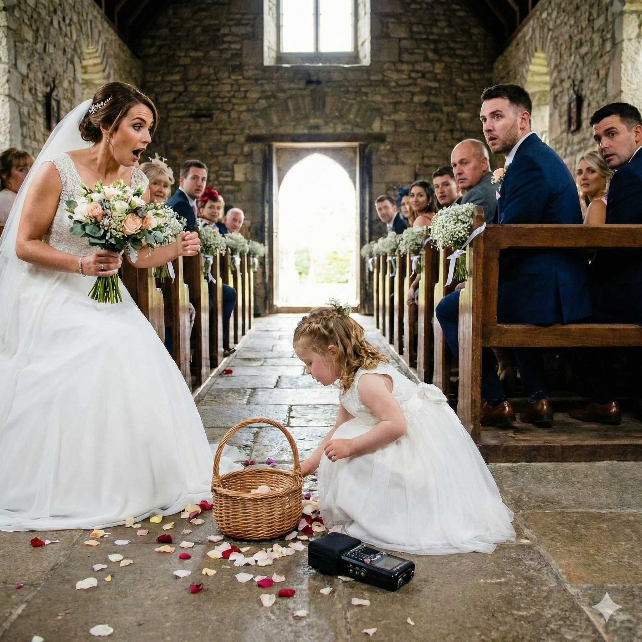 She tripped. It wasn’t a hard fall, just a stumble, but her wicker basket clattered against the marble floor. The rose petals didn’t scatter. Instead, a heavy, cream-colored envelope slid across the floor, coming to rest exactly against the toe of my satin pump.