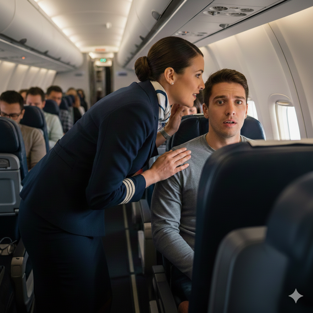 I knew something was wrong the moment the flight attendant leaned down beside my aisle seat, lowered her voice, and said those words —
