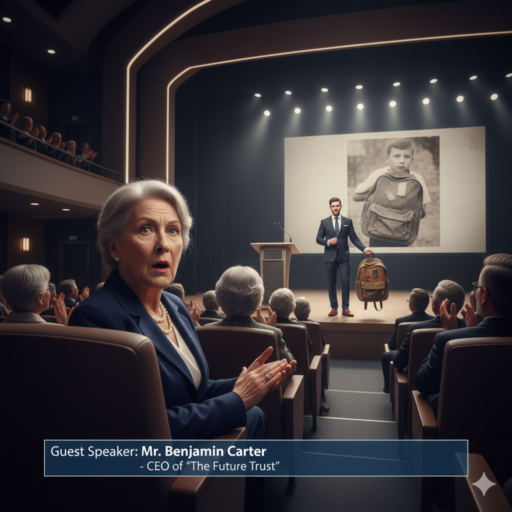 “Good evening,” he began, voice steady. “I grew up in foster care. I moved home to home, school to school. I didn’t own much. Including my backpack.”