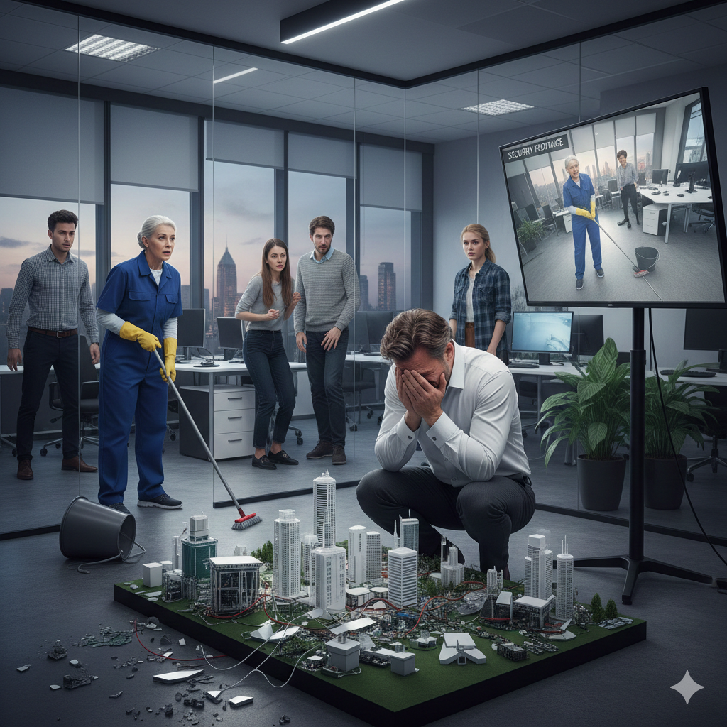 The janitorial cart hit a snag. One wheel locked. Rosa tugged it. Harder. The cart jerked violently. The mop handle swung. The prototype shuddered on its pedestal—balanced, wobbled—and then crashed in slow, horrifying motion.