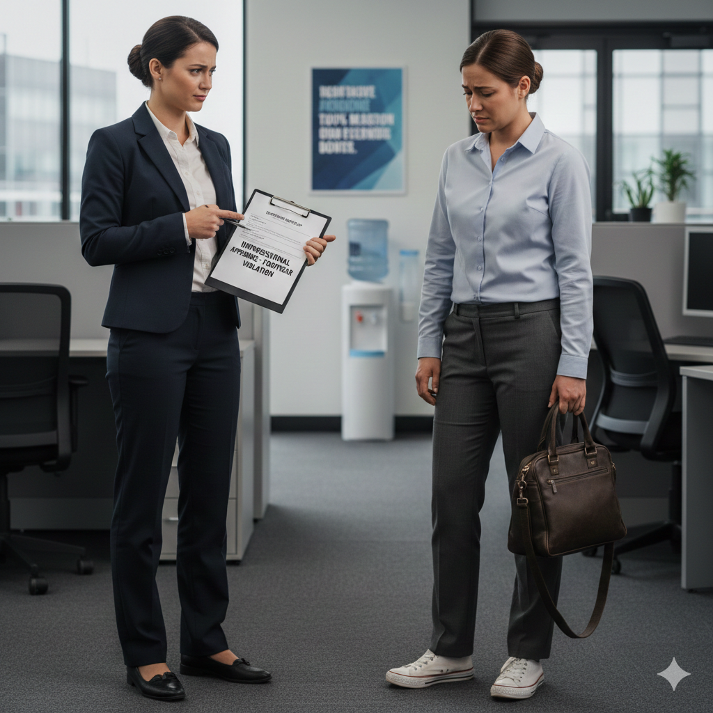 “You’ve said that for weeks.” Marla tapped a manicured nail against her clipboard. “Your appearance violates our dress policy. Again. And I can’t let this slide because you’re… dealing with personal issues.”