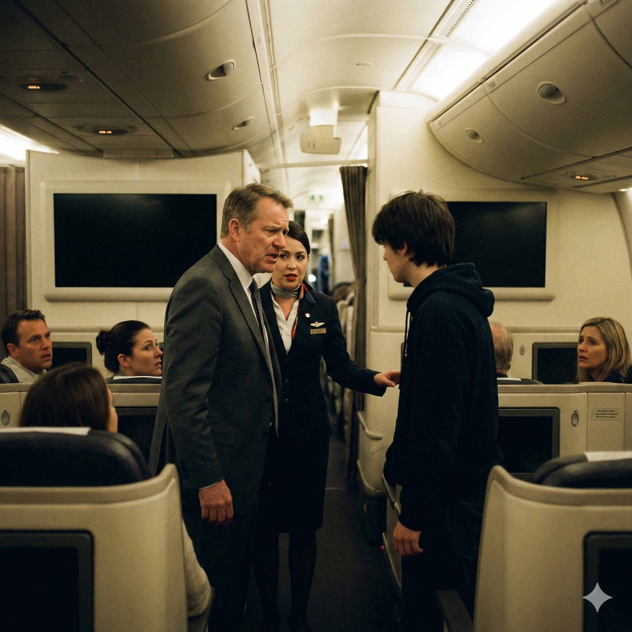 The cabin went silent. A few people pulled out their phones. The injustice was palpable—a quiet kid being bullied by a billionaire and a biased flight attendant.