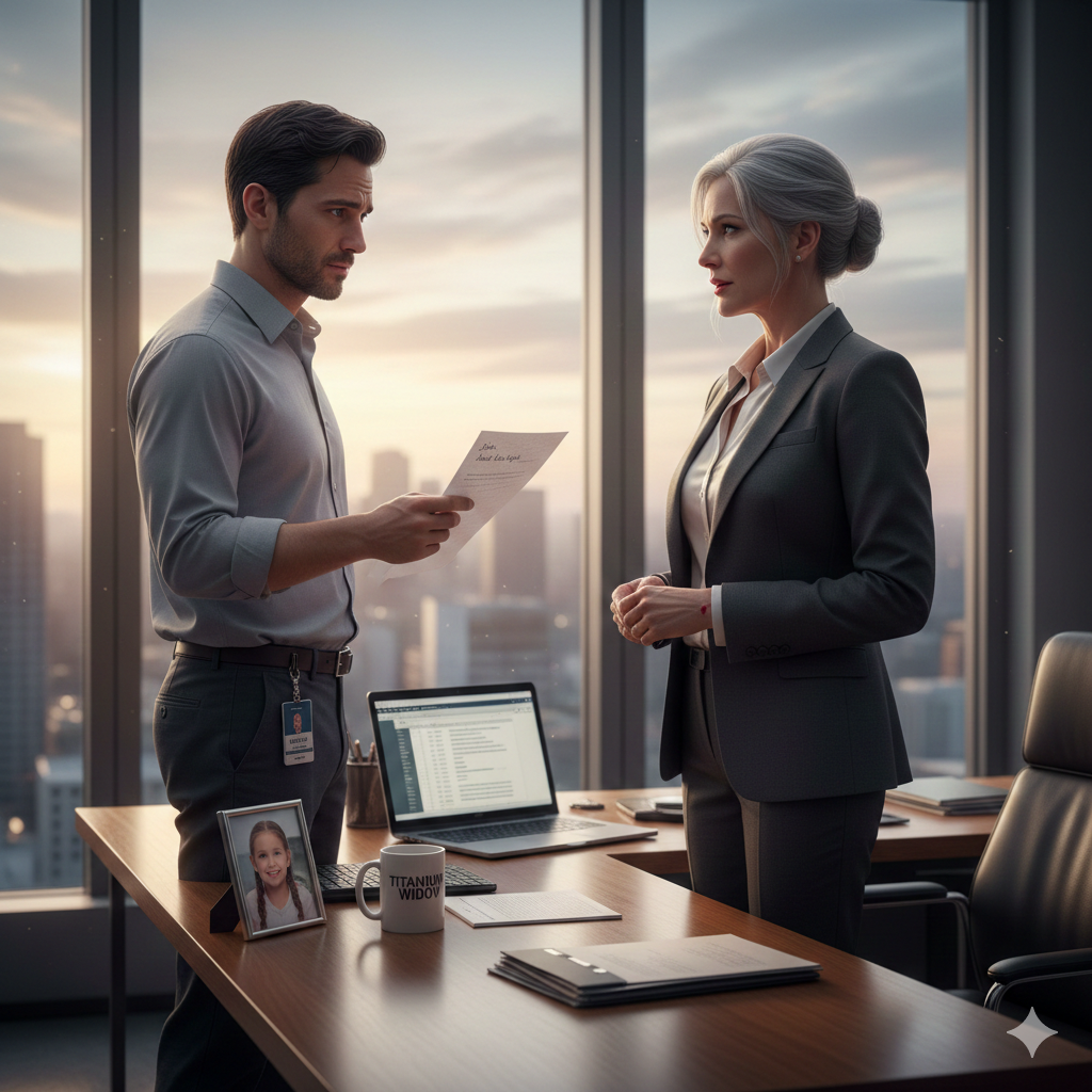 Liam entered Diane’s office. She was standing at the floor-to-ceiling window, her back to him. She looked perfect. Not a hair out of place. The Titanium Widow was back.