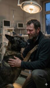 Before I could move, before I could process what was happening, the man dropped to his knees, wrapping both arms around the dog’s neck as Rex growled low and mechanical, his teeth clicking inches from the man’s face while the waiting room erupted in screams, chairs scraping, carriers clattering to the floor as people fled.