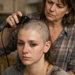 Emily sat on the old wooden chair in the kitchen, her hands clenched so tightly against her knees that they turned white. The hair clippers vibrated in her mother’s hands, the “zzz” sound like a verdict.