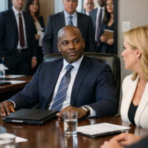She swaggered into his chair – minutes later, the room froze as the Black CEO calmly revealed that he had secretly taken control of the entire company overnight