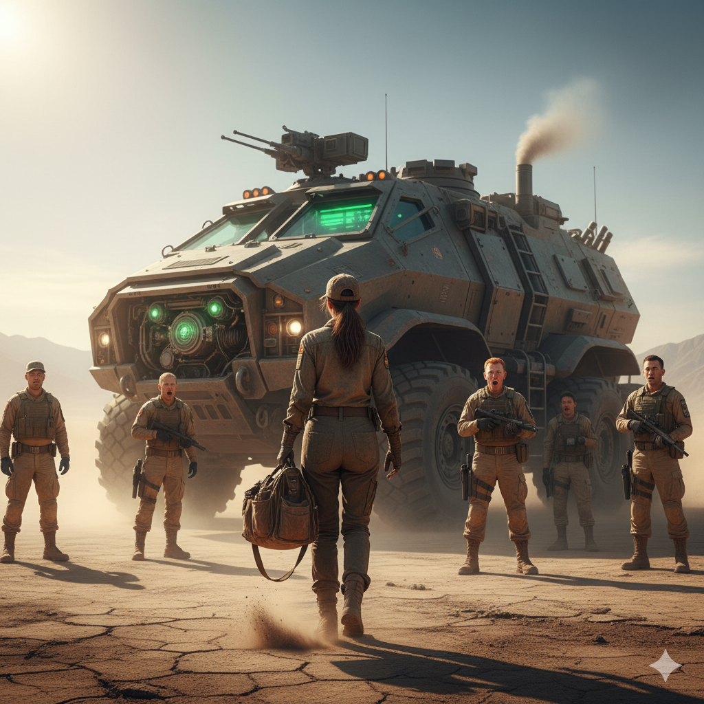 He turned back to Kael, who had still not moved, her figure now framed against the colossal, revived vehicle, a silent testament to her skill. The other soldiers, who had been ready to intimidate her, now stood dumbfounded, their blasters still holstered, their cruel jokes forgotten. The desert, which had seemed so empty, now felt charged with Kael’s silent power.
