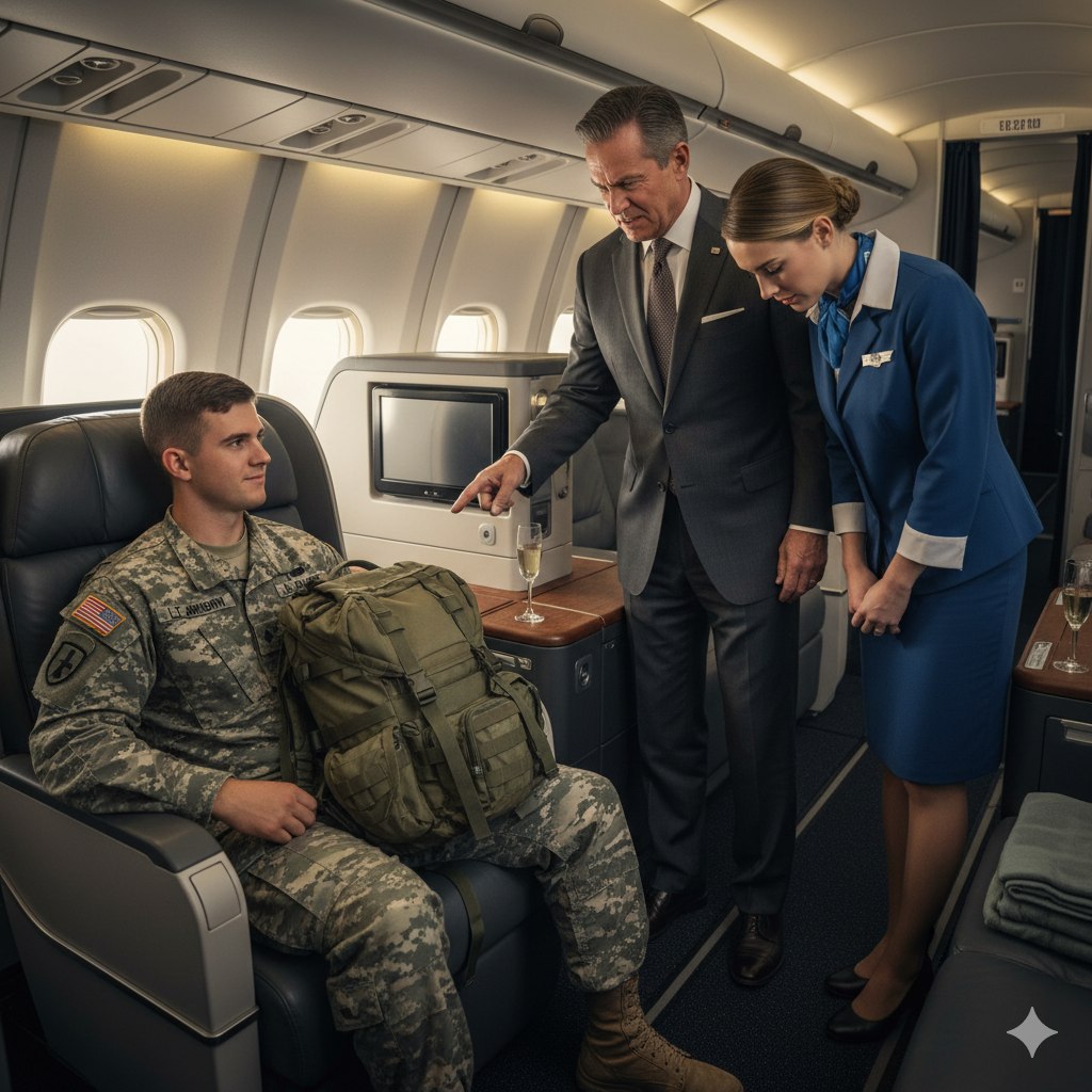 Mr. Davenport spoke softly to the Head Flight Attendant: “Miss, please… bring him a warm blanket and a soft pillow. And… move me to the Economy section. Seat 1A truly belongs to Lieutenant Harrison. He needs it more than I do.”