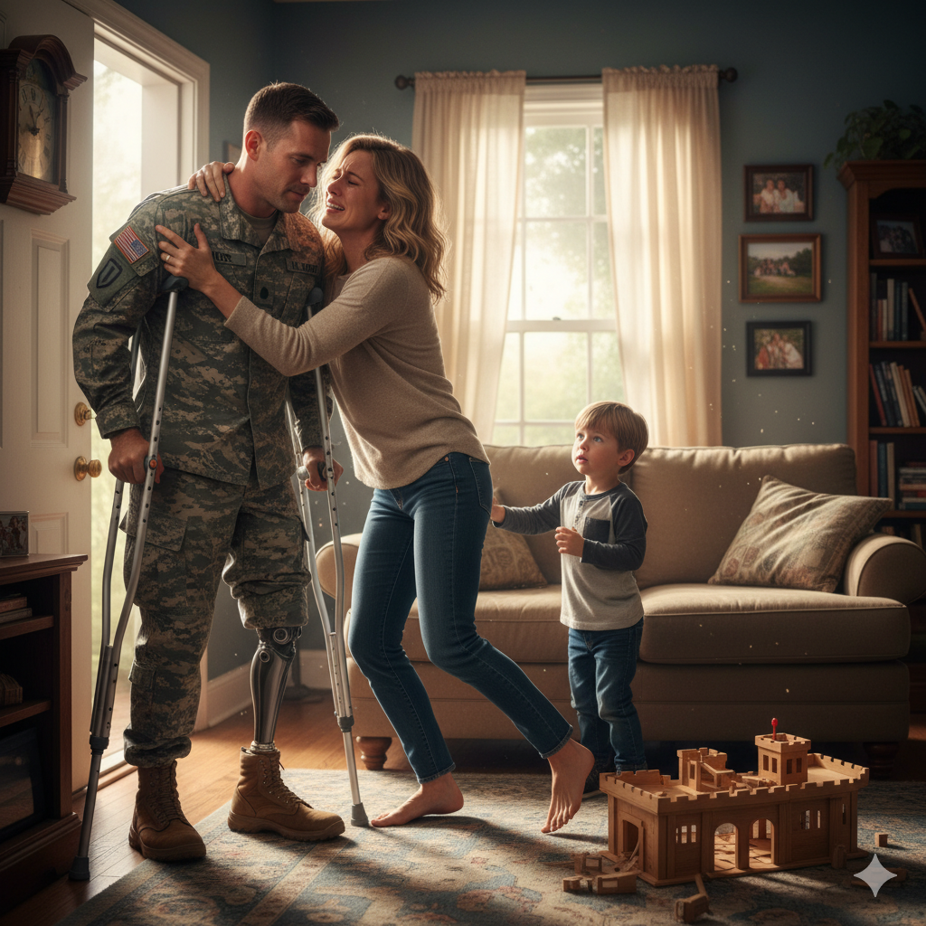 Sarah was speechless. Her brown eyes were flooded, not with fear or revulsion, but with an overwhelming sorrow mixed with the bursting joy of seeing her husband alive. She rushed to him, heedless of the crutches, wrapping her arms around him tightly and burying her face in his chest.