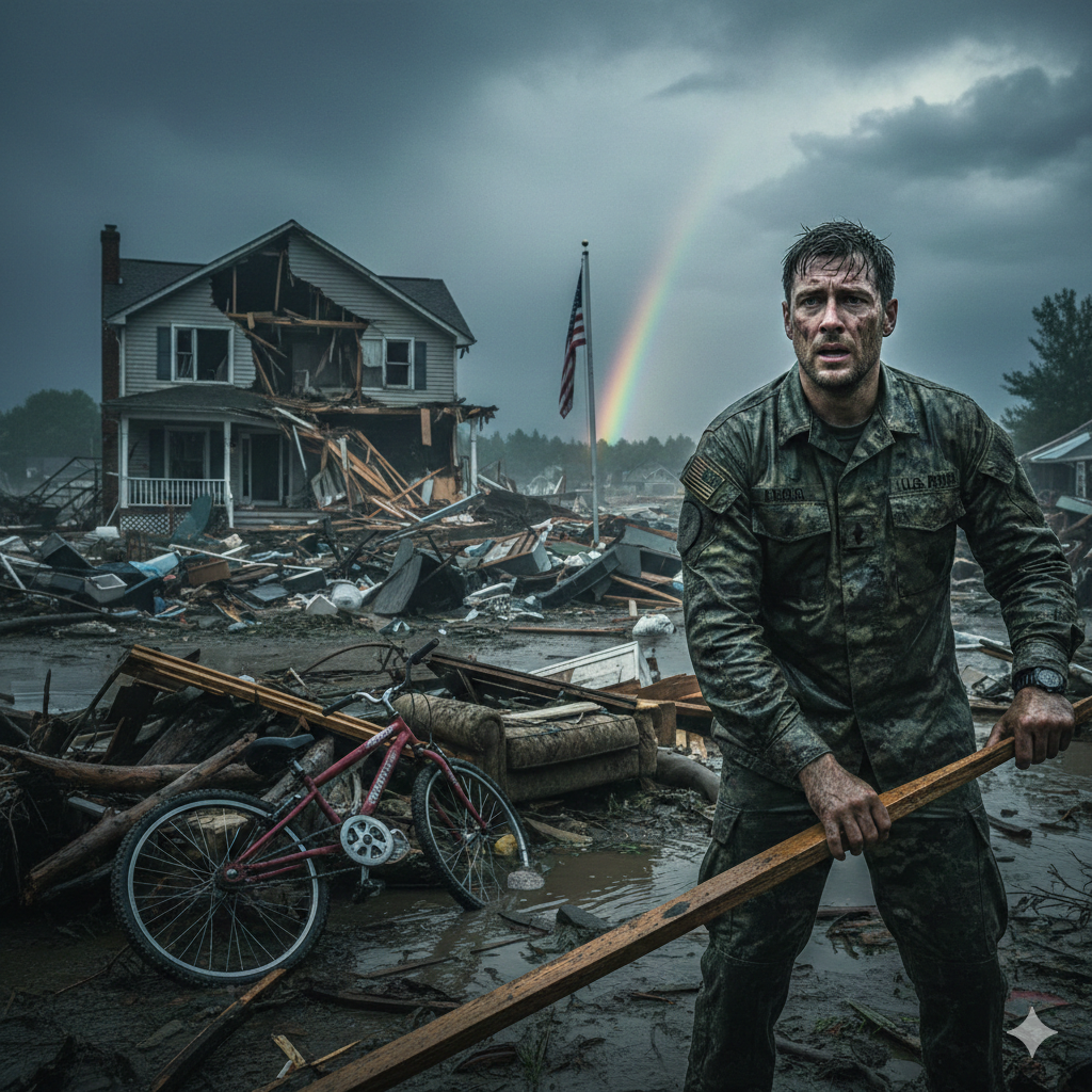 He covered Evan with his body just as the back wall burst open. Wind and water exploded inside like a monster breaking into the room. In seconds, chaos swallowed everything.