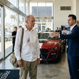 Splash! Without hesitation, Brad doused the old man’s chest with the freezing water. The ice cubes clattered to the floor as the white shirt became translucent and soaked. The showroom erupted in cruel laughter. The man didn’t flinch. He didn’t shout. He simply took a handkerchief from his pocket, wiped his face, and looked Brad directly in the eye—a gaze so piercing it made the manager momentarily shudder. Without a word, the man turned and walked out.