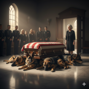 The military dogs formed a silent wall around their handler’s casket, refusing to move or grant passage to anyone. Their steadfast vigil remained unbroken until a single figure entered the room, finally softening the unyielding guard of these loyal warriors